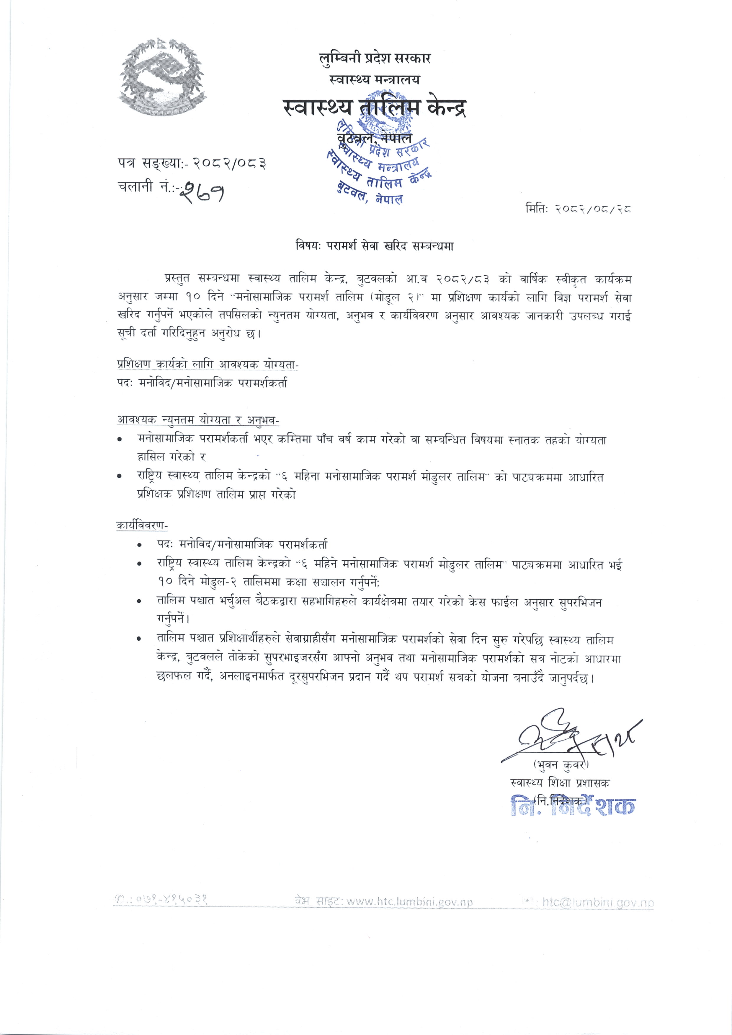 परिचय:- बिक्रम सम्बत २०७५ सालमा यो स्वास्थ्य तालिम केन्द्रको नाममा स्थापना भएको हो। लुम्बिनी प्रदेश सरकार, स्वास्थ्य मन्त्रालय अन्तर्गत रहेको यस स्वास्थ्य तालिम केन्द्रले आफ्नो जिम्मेवारीमा रहेका स्वास्थ्य सम्बन्धि तालिम गतिविधिहरुलाई अगाडि बढाइरहेको छ। यो केन्द्र लुम्बिनी प्रदेशभित्र स्वास्थ्य सम्बन्धी तालिमका गतिविधिहरु सञ्चालन, व्यवस्थापनको लागी सहयोग गर्ने प्रमुख प्राविधिक इकाई हो।